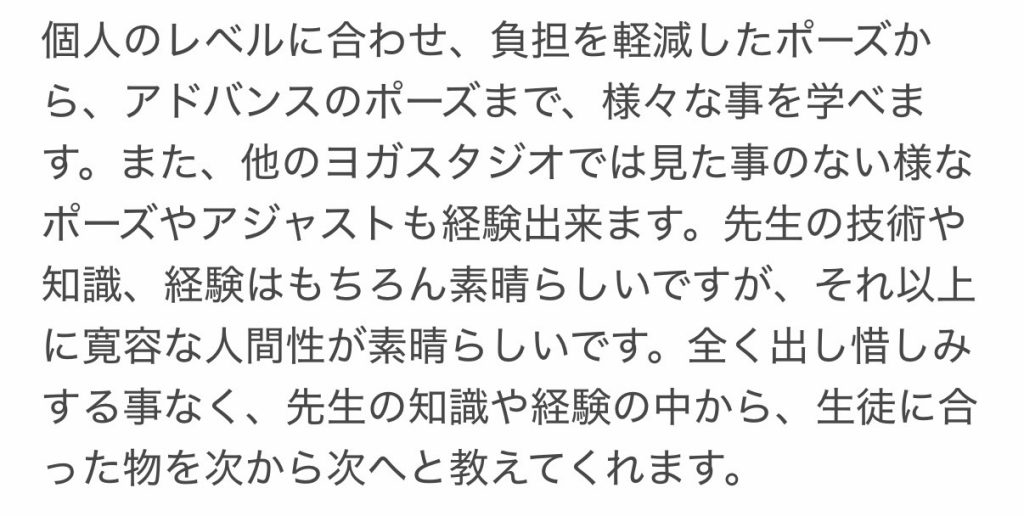 「個人のレベルに合わせ、負担を軽減したポーズからアドバンスのポーズまで、様々なことを学べます。他のヨガスタジオでは見たことのないようなポーズやアジャストも経験できます。先生の技術や知識、経験はもちろん素晴らしいですが、それ以上に寛容な人間性が素晴らしいです。